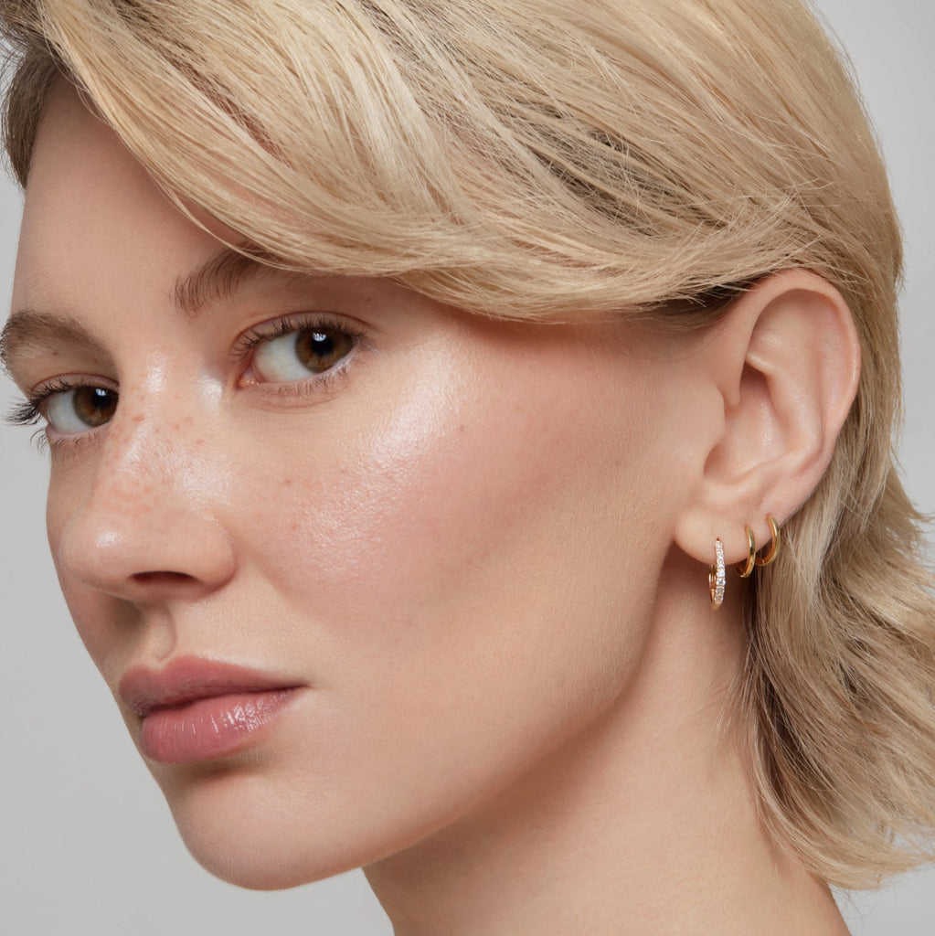 Our Mini Huggie Hoops feature a hinge clasp that makes them easy to put on.