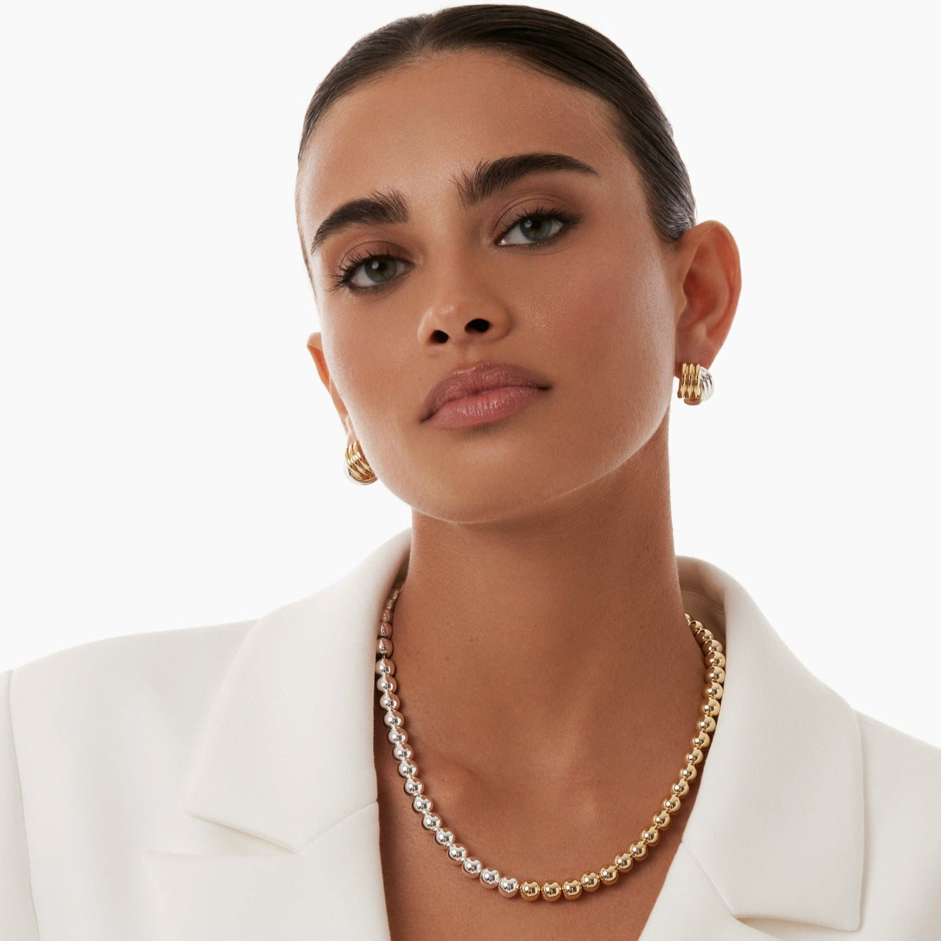 This sophisticated beaded necklace features a stylish mix of metals, blending elegance with modern design.