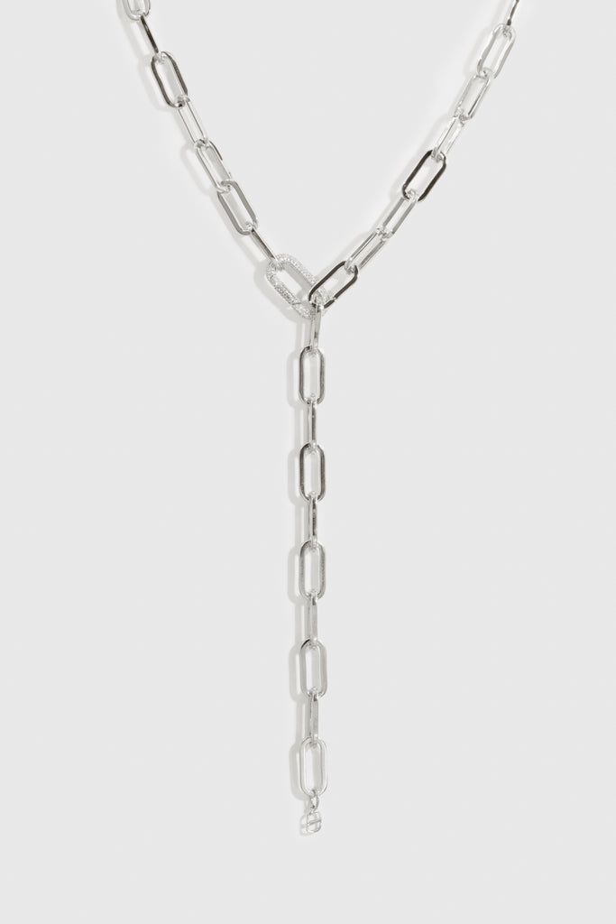 The Maximalist Paper Clips Lariat Necklace features oversized interlocking paper clip links in a sleek lariat design, offering a bold yet refined statement.