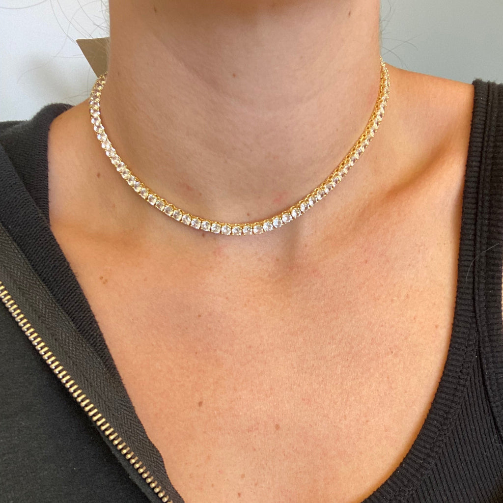 We took everyone’s favorite, the Tennis Choker, and enhanced the design. Adorn your neck with this gold-plated spectacular stunner. This sophisticated Tennis Choker is custom-cut in sleek crystal clear cubic zirconia 4mm stones. The delicate yet durable clasp fits perfectly on your collarbone because it comes in adjustable sizing. This tennis choker will take you everywhere from day to night. Designed to perfection in Montreal, Canada.