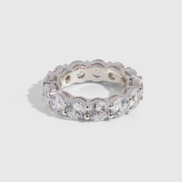 A stunning one-of-a-kind stacking ring that features a solid sterling silver base. Encrusted to the brim in sparkling cubic zirconia crystals which are perfectly flanked round.
