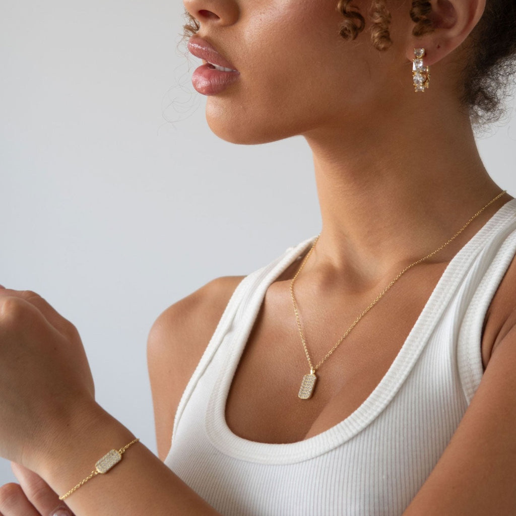 Ajoutez une touche de personnalisation à votre look avec le bracelet Matilda. Avec un superbe design inspiré de la plaque signalétique et de délicats accents pavés, ce bracelet respire l'élégance féminine, parfait pour toute occasion.