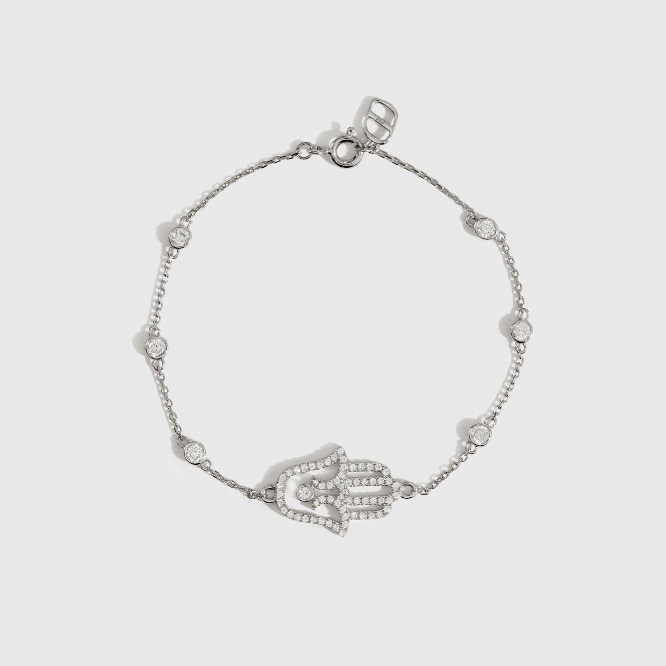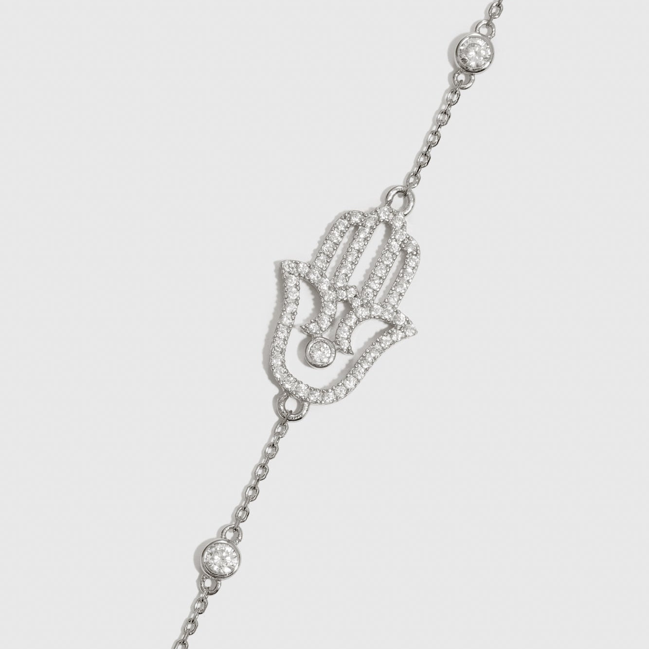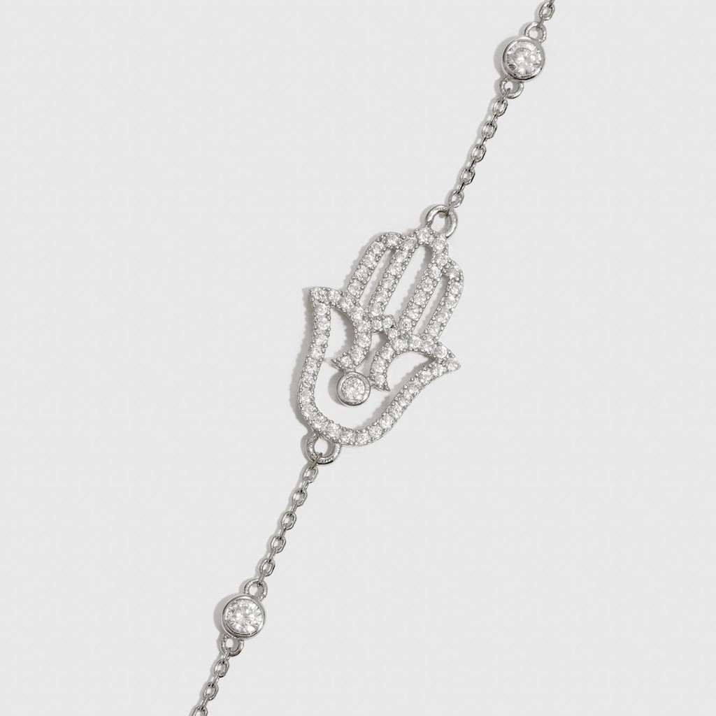Le Bracelet Main de Fatma Pavé associe un savoir-faire élégant à un symbolisme intemporel, avec des pierres pavé scintillantes mises en valeur sur le pendentif Hamsa.
