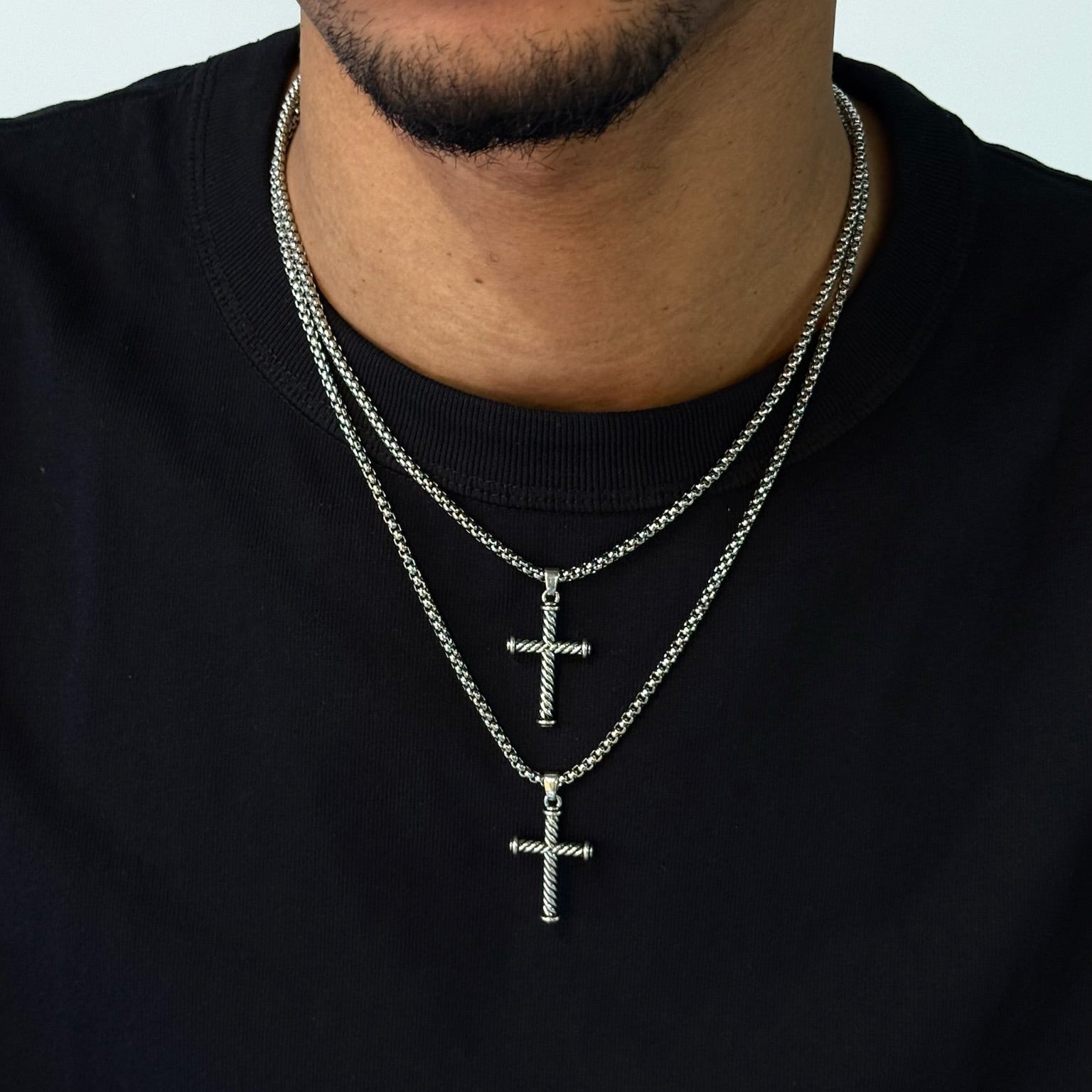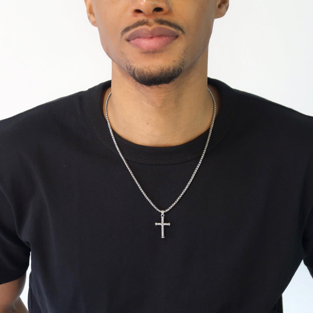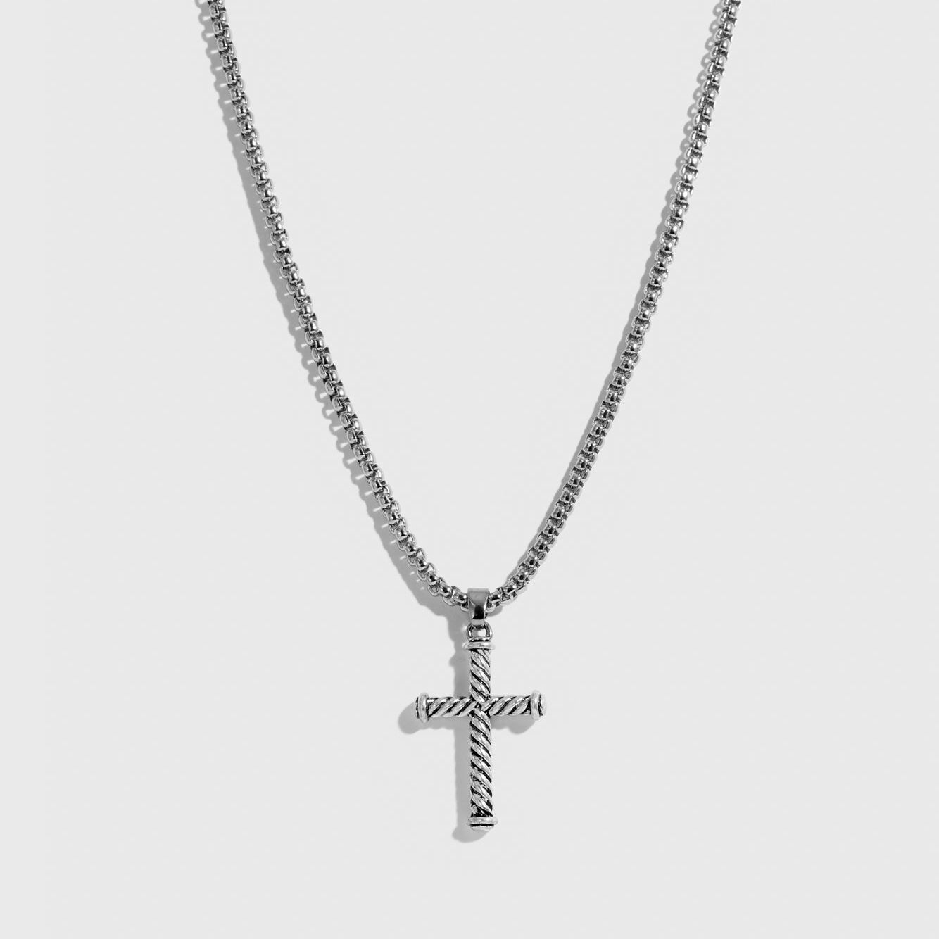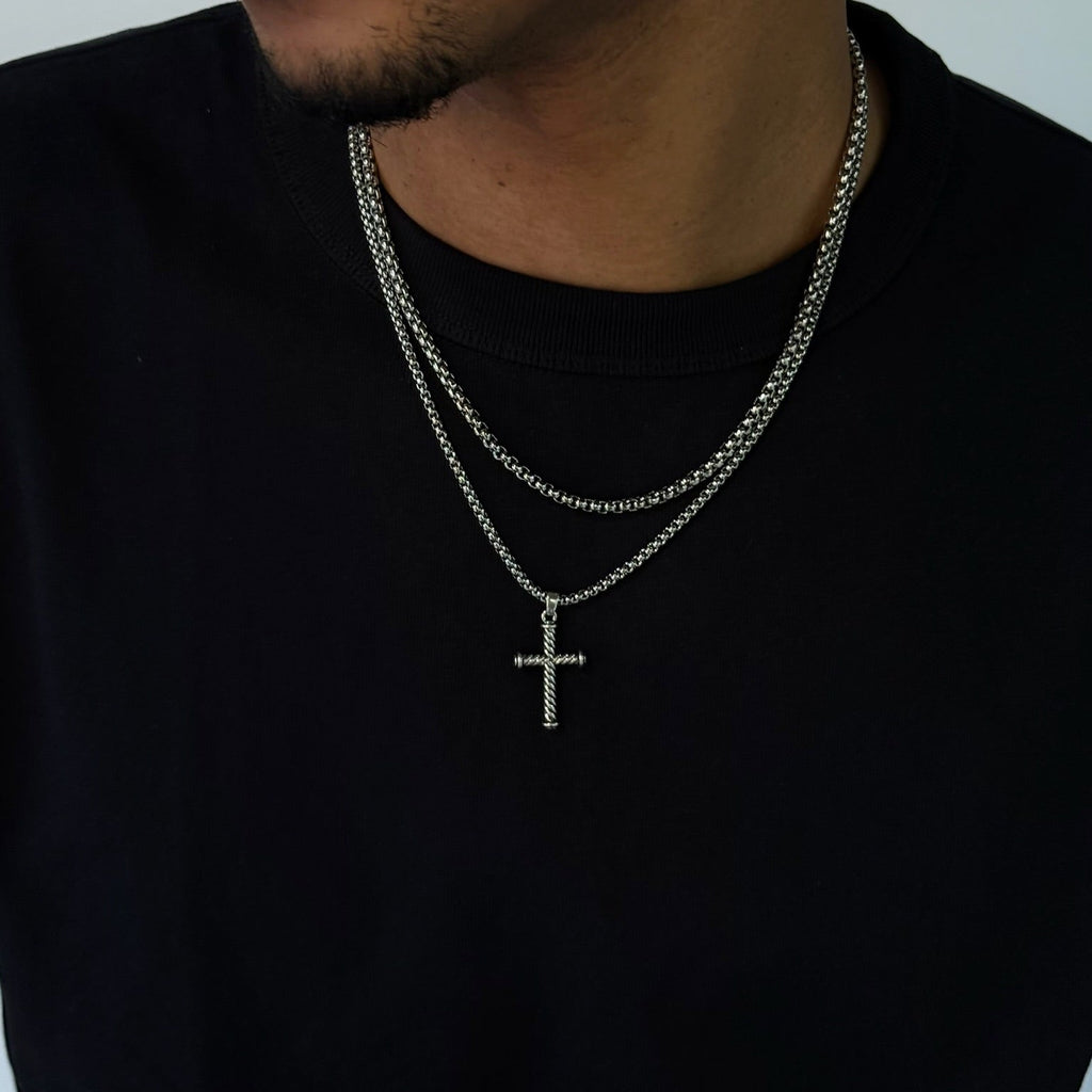 Le pendentif en croix, travaillé avec précision, repose sur une chaîne résistante pour un style à la fois symbolique et contemporain.
