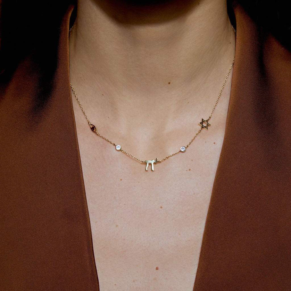 Un collier raffiné alliant l’Étoile de David et le symbole Chaï dans une forme délicate.