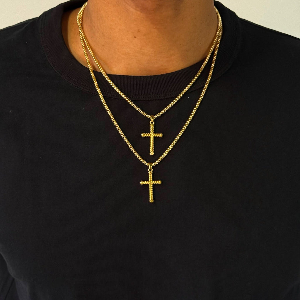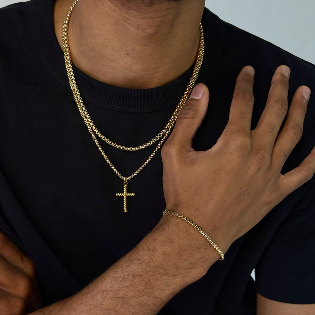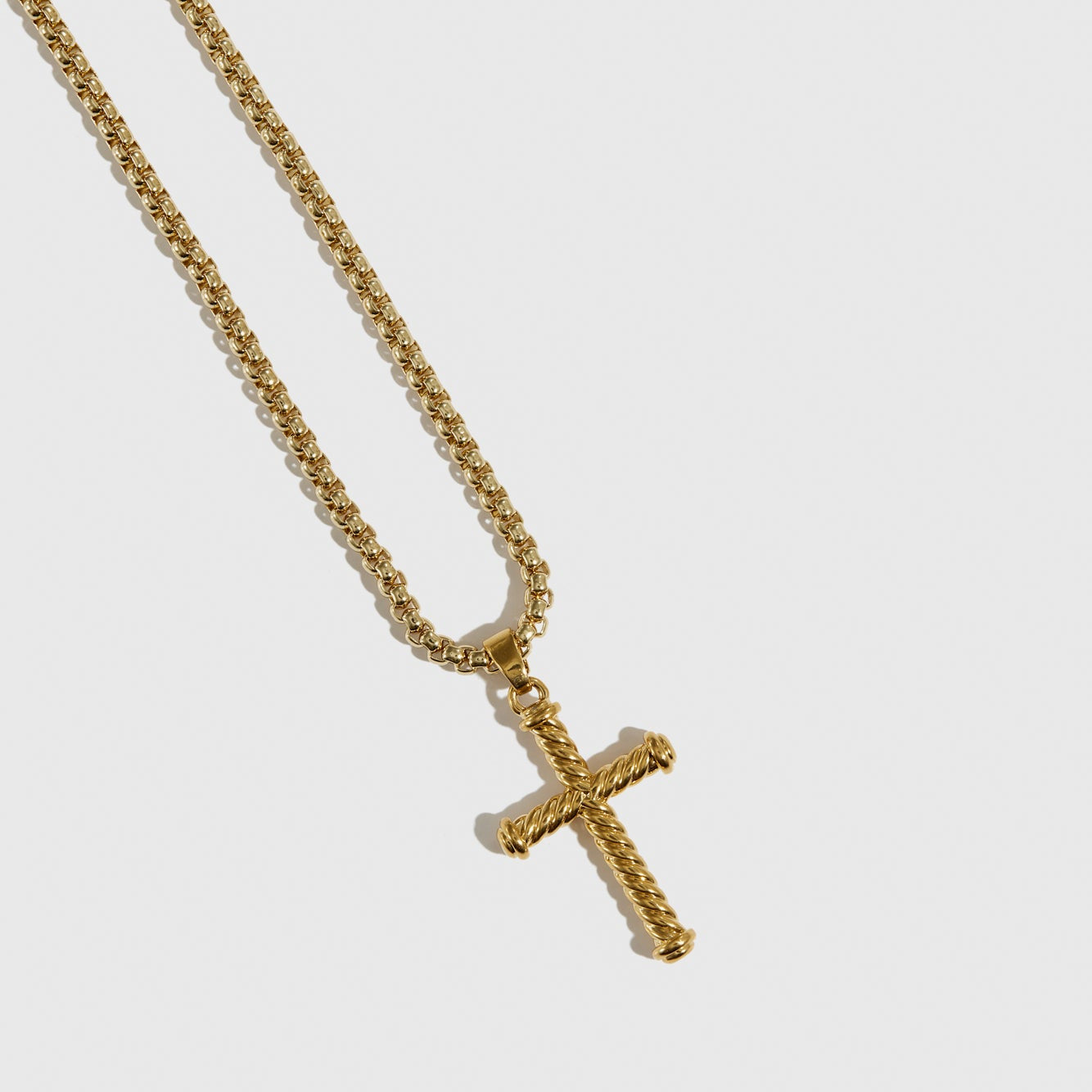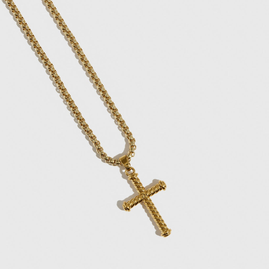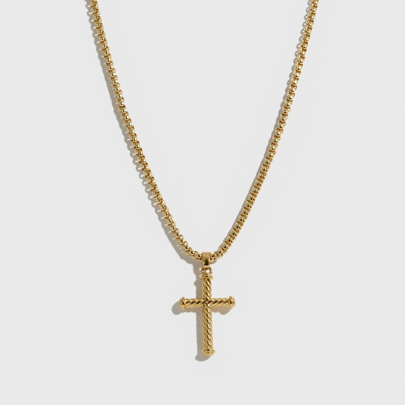 Le pendentif en croix, travaillé avec précision, repose sur une chaîne résistante pour un style à la fois symbolique et contemporain.